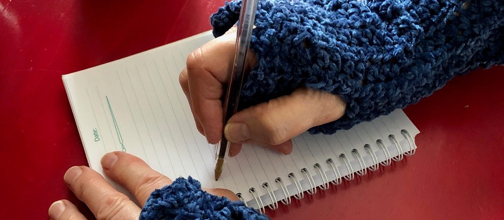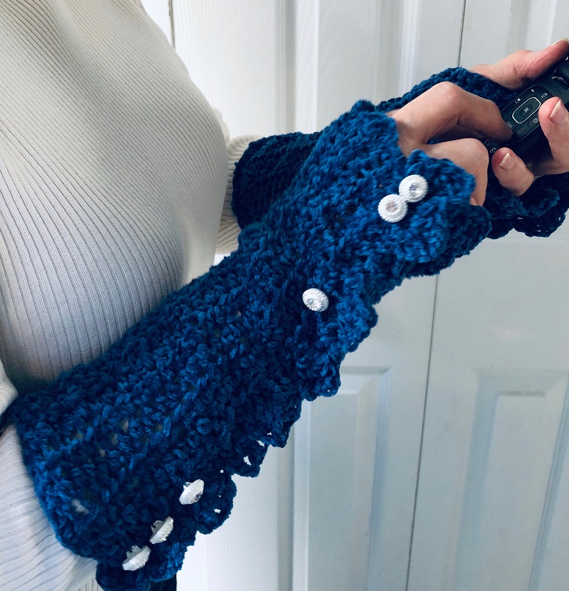 Crocheted Fingerless Glove/Wrist warmer hand crocheted in blue chenille yarn with antique white and rhinestone button accents. One size (Adult) fits most. Cozy warm without being too hot or restricting. Two gloves (one pair)